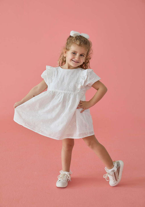 Patique Kız Çocuk Elbise Beyaz Brode Çiçek Desenli