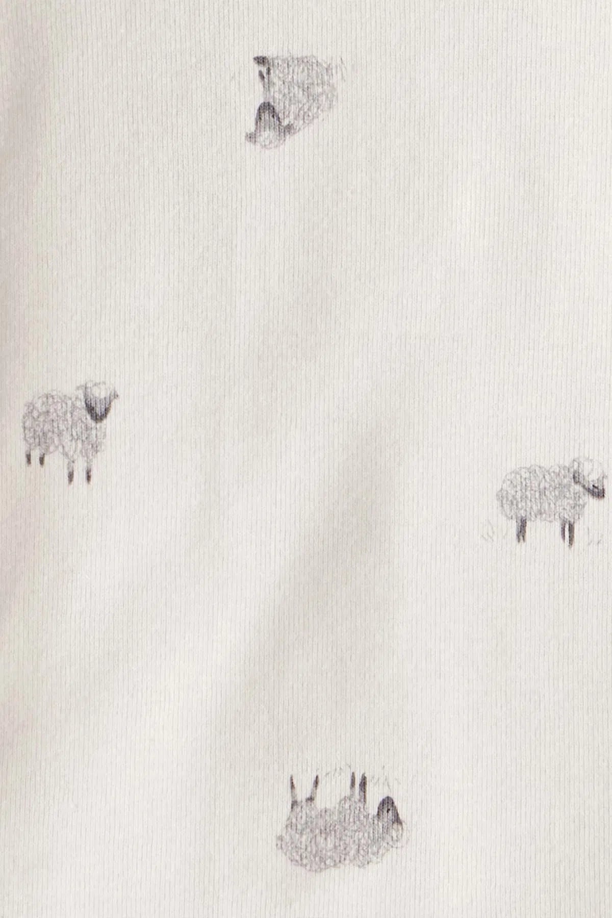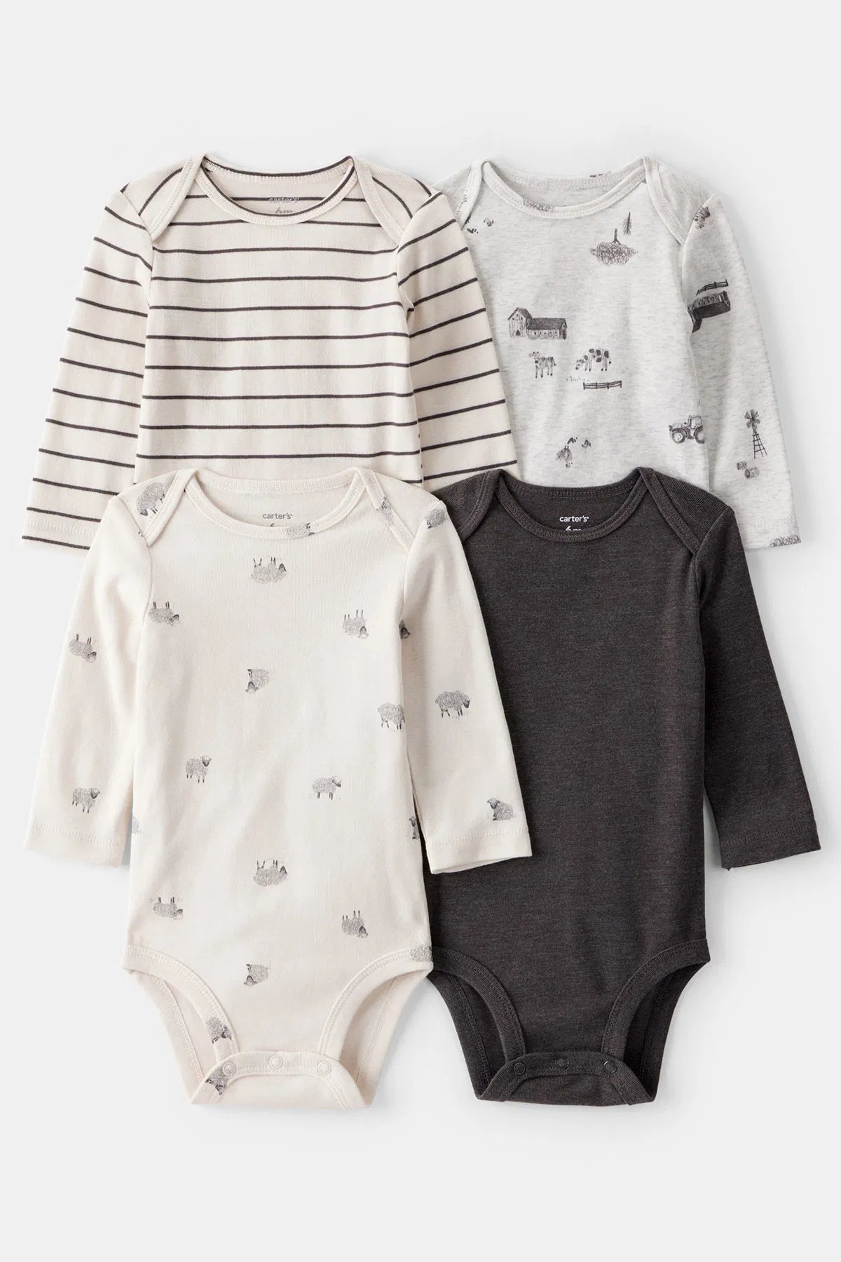 - Çizgili, koyun, ahır ve traktör desenlerinin karışımından oluşan set dört adet uzun kollu tulum içerir